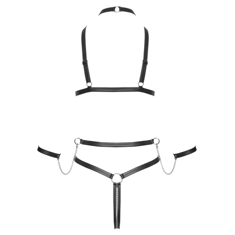 Foran finder du en aftagelig kæde, der både pynter og pirrer – og som kan tages af, hvis du vil skifte fra bondage-vibe til bare flot lingeri. Med i sættet får du også to matchende håndjern med kæder, som let kan sættes fast på harnesset.