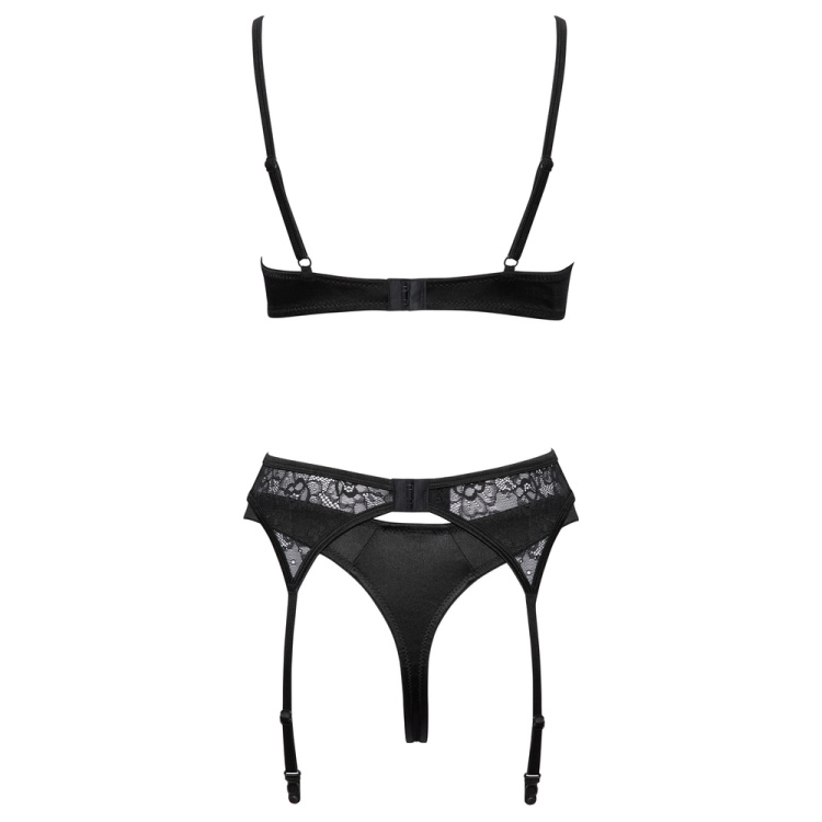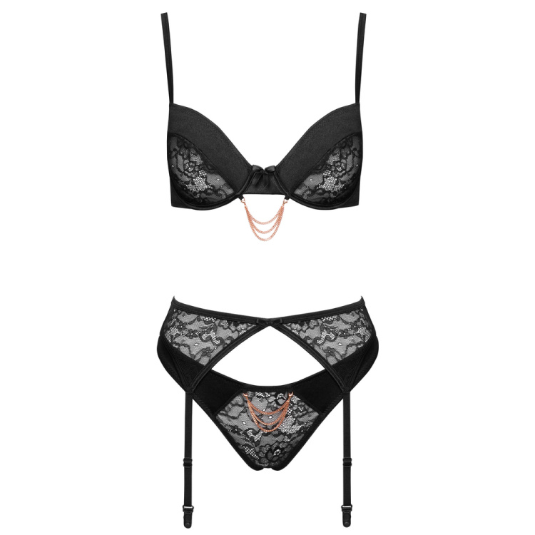 Gør dit look ekstra forførende med dette eksklusive lingerisæt. Sættet kombinerer elegance og sensualitet, perfekt til særlige lejligheder eller når du vil forkæle dig selv. Den delikate blonde, elastiske satin og aftagelige smykkekæder skaber en sofistikeret og sensuel stil.