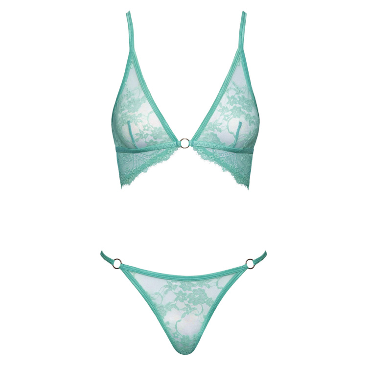 Et sødt sæt i mintgrøn blonde, der kombinerer blød komfort med flirtende detaljer. Den bøjlefri BH har justerbare criss-cross stropper og fine sølvringe, mens den matchende G-streng fuldender looket med sin delikate, tætsiddende pasform. Perfekt til dig, der vil føle dig lækker – helt uden at gå på kompromis med komforten.