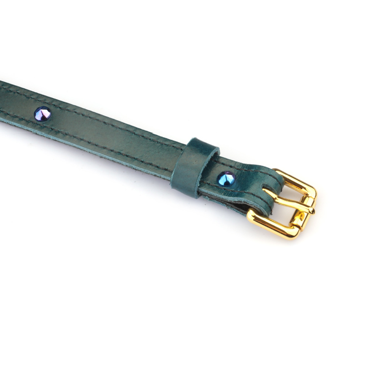 Denne luksuriøse choker er fremstillet i premium olievokslæder og udsmykket med skinnende ædelsten, der skifter mellem blå og lilla nuancer, alt efter hvordan lyset fanger dem. Kombinationen af blødt, robust læder og funklende detaljer giver et eksklusivt og forførende look, der gør chokeren til både et smykke og et kinky accessory.