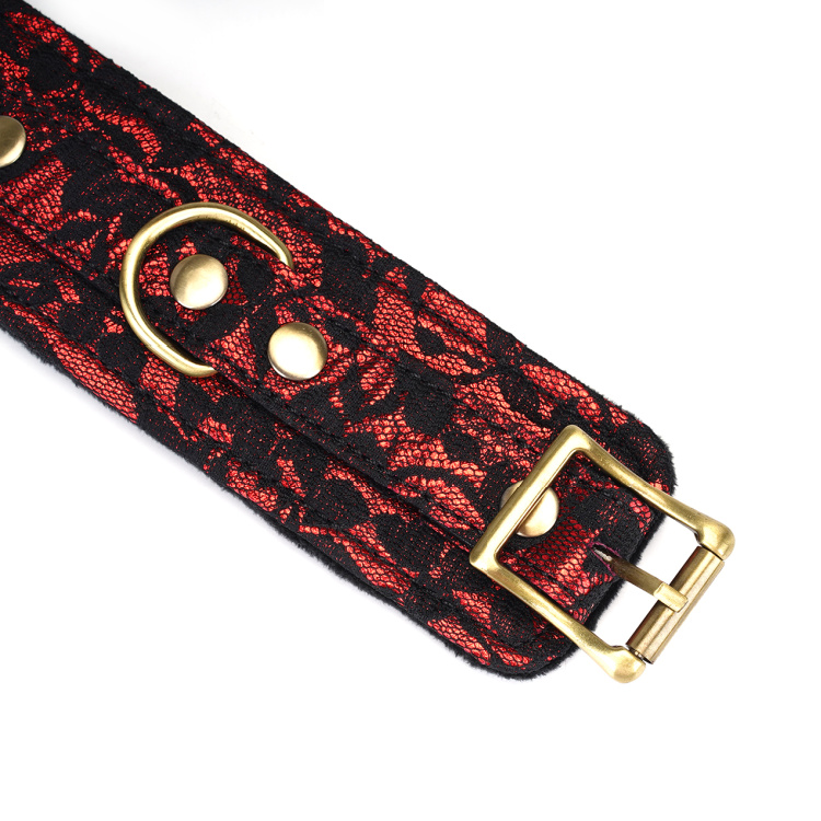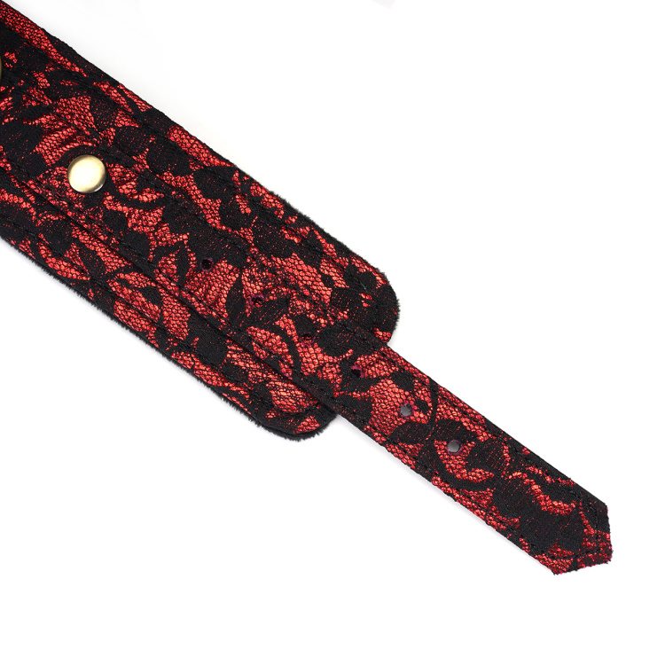 Det rubinrøde veganske læder dækket af sort blonde giver manchetterne et dramatisk og sensuelt udtryk, mens den bløde faux fur på indersiden omslutter håndleddene med luksuriøs komfort. De solide messingfarvede spænder, sikrer et perfekt fit og giver samtidig et strejf af vintage glamour.